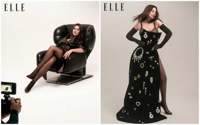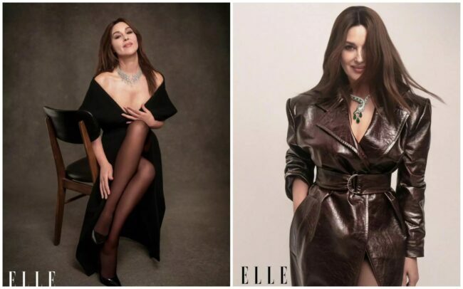 Итальянка позировала в четырех образах. Первый – в чулках, кожаной куртке и золотом украшении с изумрудами и бриллиантами от Cartie. Второй – в облегающем черном платье с глубоким разрезом. Третий - прозрачное боди с узким кожаным поясом и шортами. Четвертый - наряд в стиле «нуар».