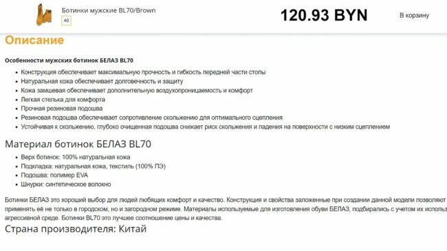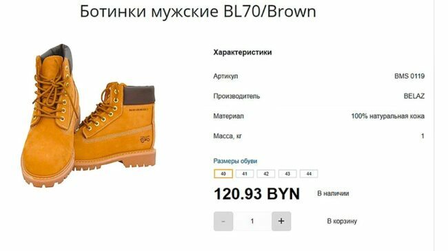 Сегодня одну пару ботинок БелАЗ можно купить ориентировочно за 121 белорусских рублей, что по курсу в российских рублях составляет ориентировочно 3540 руб.