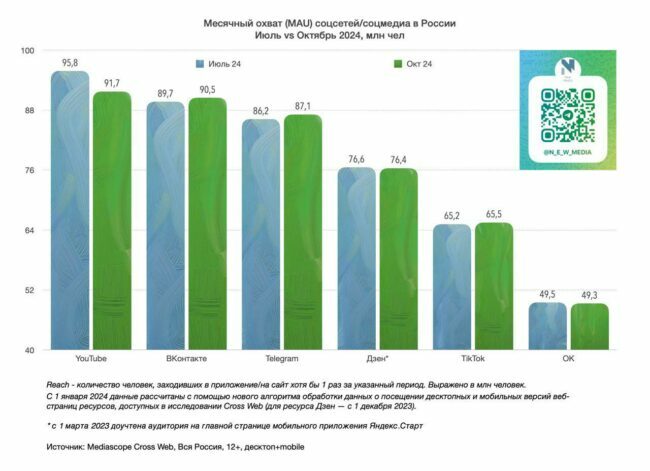 Последние данные по месячному охвату (MAU) крупных социальных сетей в России за октябрь 2024 года опубликовал Telegram-канал New Media. Из данного отчета видно, что замедление YouTube не прошло бесследно для аудитории этого ресурса. По сравнению с сентябрем видеохостинг потерял 1% аудитории в России, что составляет порядка 1,2 млн. человек. При этом YouTube остался лидером на российском рынке, и его месячный охват российской аудитории составил 91.7 млн. чел.