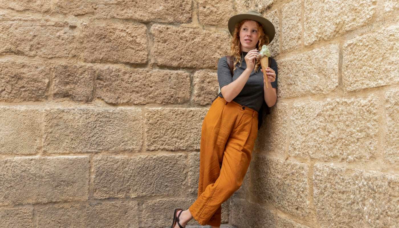 Если вы не хотите брюки яркого цвета, то обратите внимание на базовую палитру: это коричневый, черный или серый цвет.В качестве верха можно использовать блузки, но не однотонные, а такие, какие привлекут внимание. Ещё подойдут свитера и корсеты.