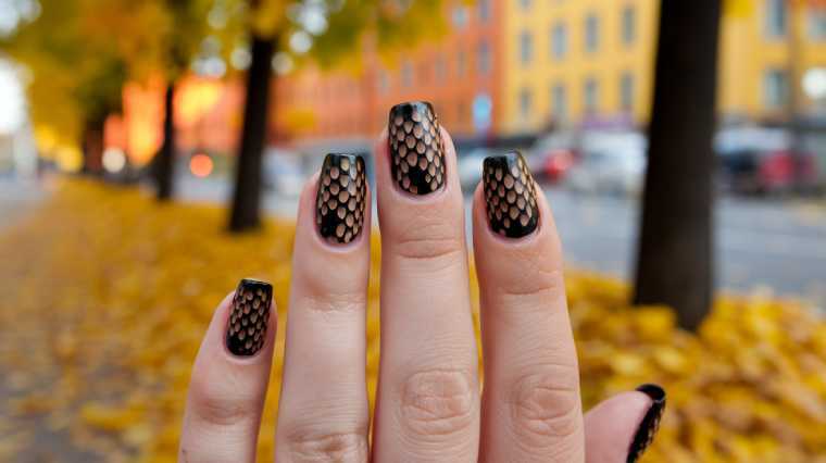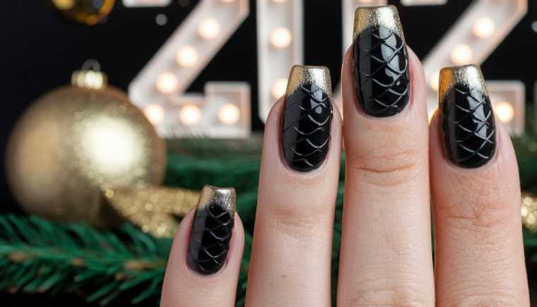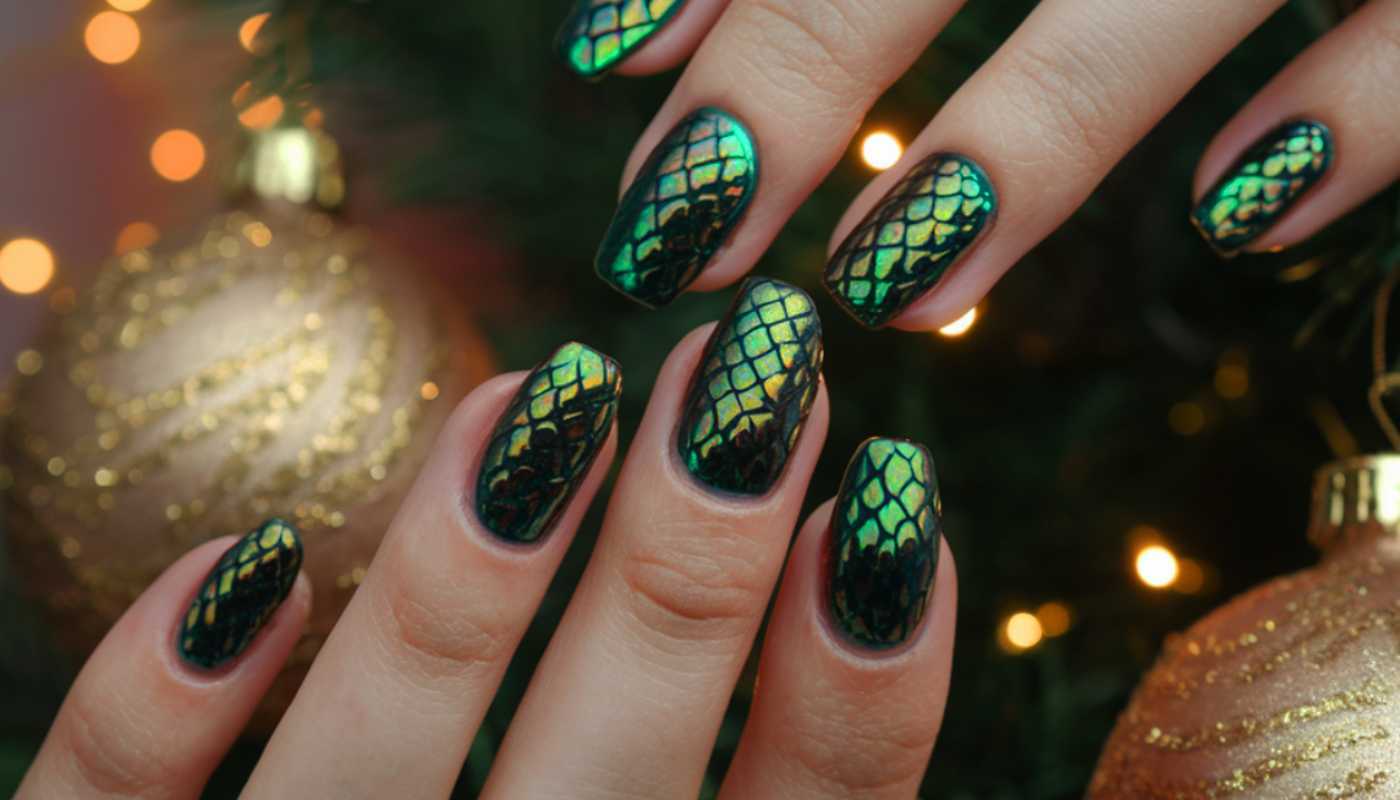 Акриловые объемные элементы, имитирующие чешую, могут быть использованы в комбинации с градиентной заливкой, создающей переходы от глубокого изумрудного до светлого мятного оттенка. Также можно отметить использование текстурных лаков с голографическим эффектом, которые придают маникюру уникальность и многослойность.