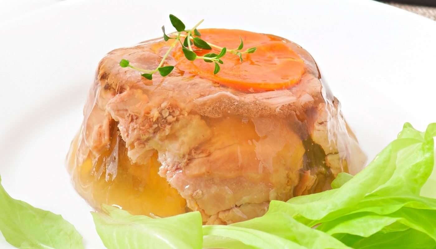 Если вам надоело возиться с приготовлением холодца, то попробуйте его заменить на куриное заливное на основе агар-агара. Приготовление блюда займет всего 20 минут и еще примерно 4 часа потребуется для того, чтобы желе успело застыть в холодильнике.
