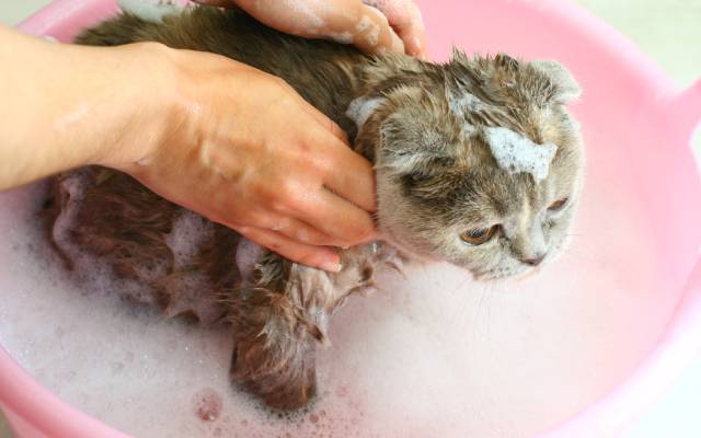 В среднем домашнюю кошку рекомендуется мыть с периодичностью один раз в три месяца. Температура воды для купания животного может варьироваться от тридцати двух до тридцати девяти градусов. Купание кошки следует осуществлять посредством применения подходящего по типу кожи и шерсти специального шампуня. Кошки имеют уровень ph отличающийся от людей, поэтому мыть их с использованием человеческих шампуней и мыла не рекомендуется.