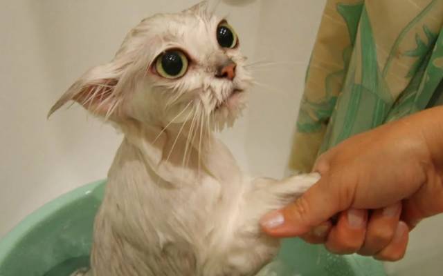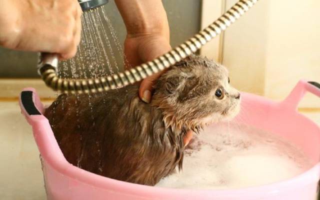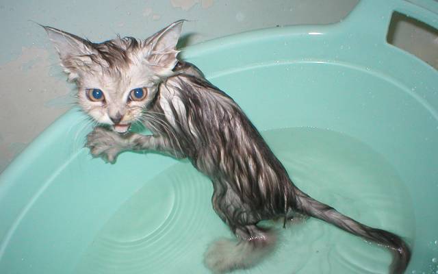 В ёмкость для мытья кошка должна быть посажена максимально аккуратно. Во избежание получения царапин т для того, чтобы животное не вырвалось, рамках погружения в воду кошку можно держать за шкирку. На голову животного должна быть надета специальная шапочка для купания или же можно закрыть уши питомца посредством вкладывания в них ватных тампонов. Шерсть кошки должна поливаться тёплой водой. Попадания воды в глаза, нос и уши лучше всего избегать.