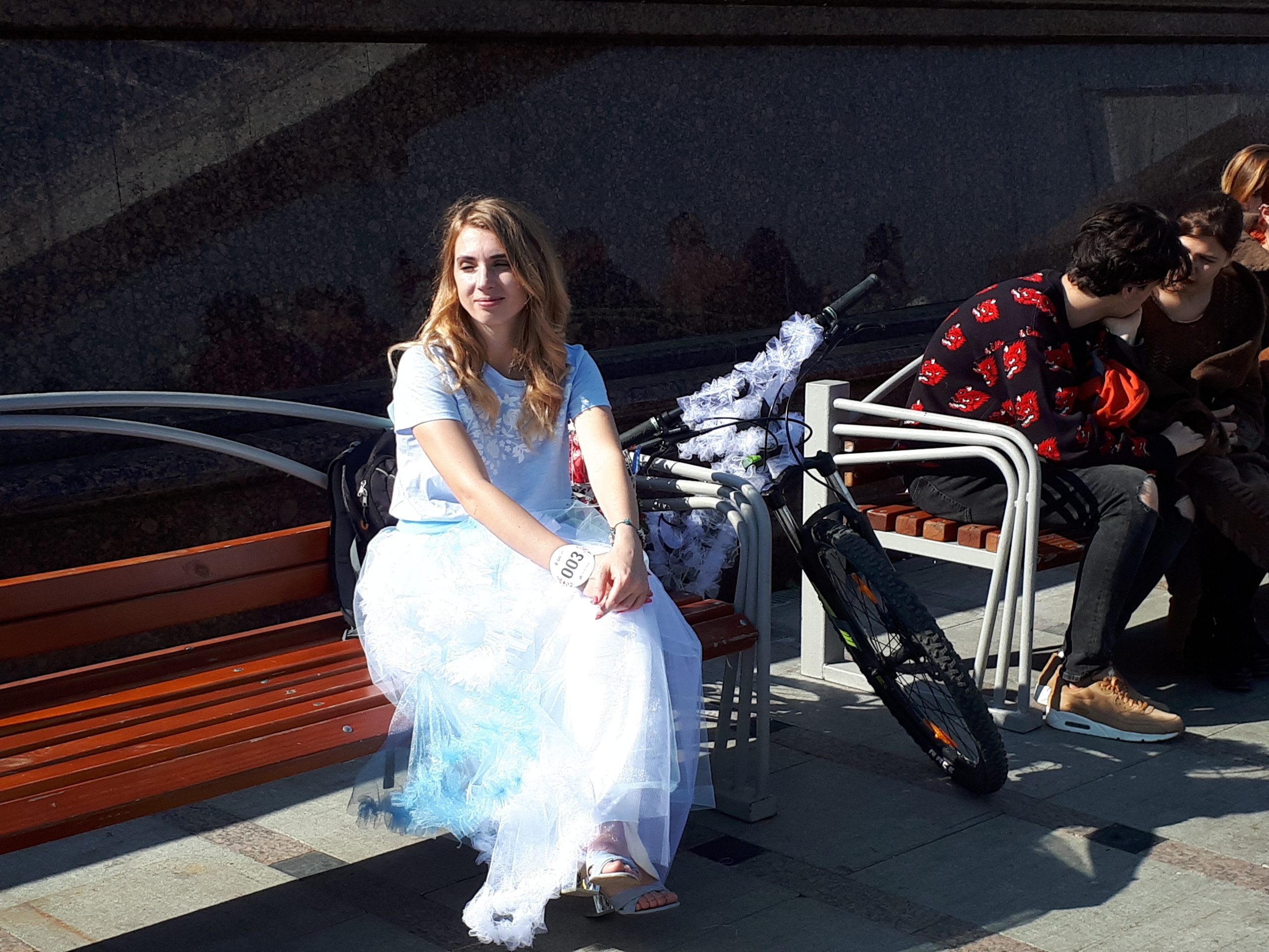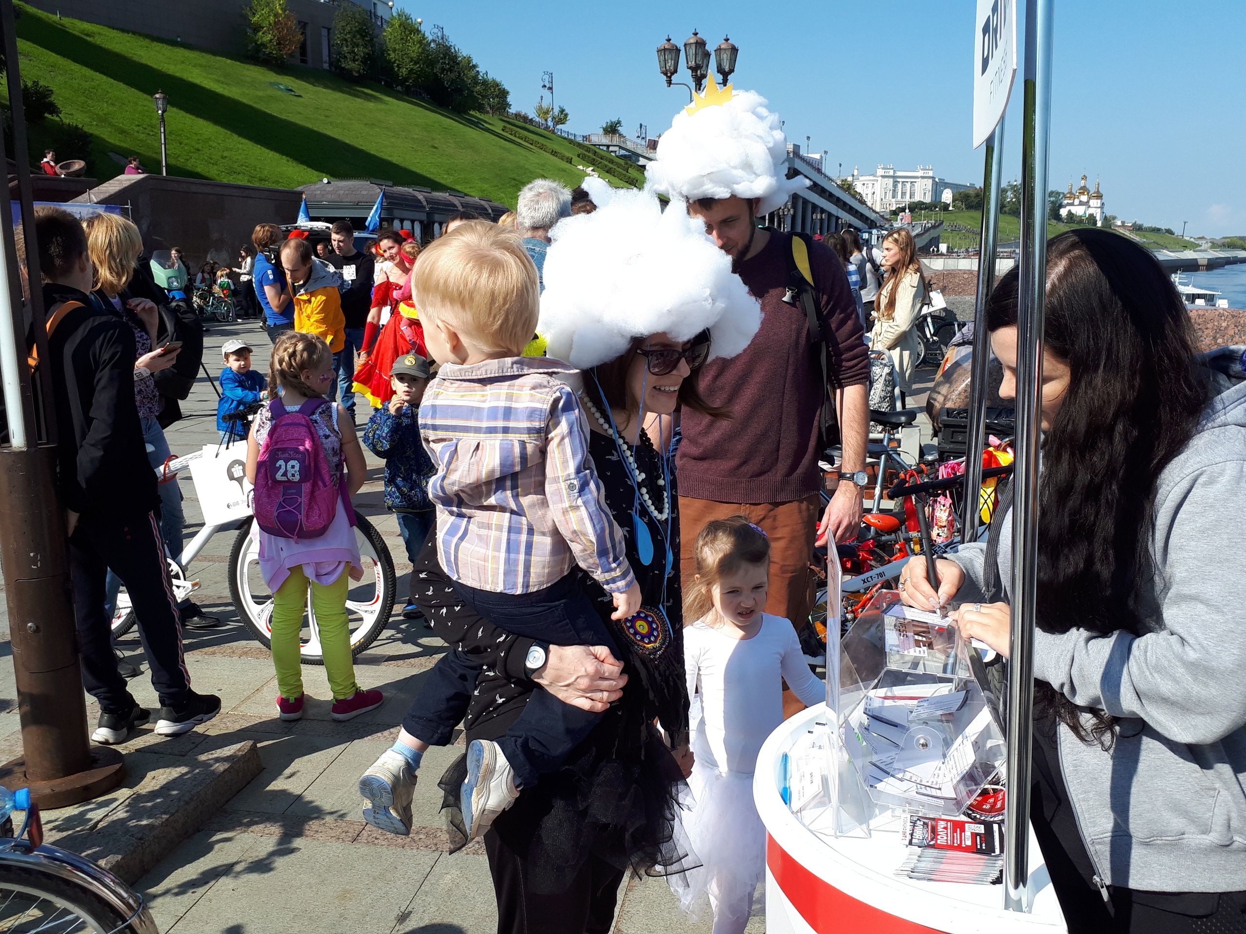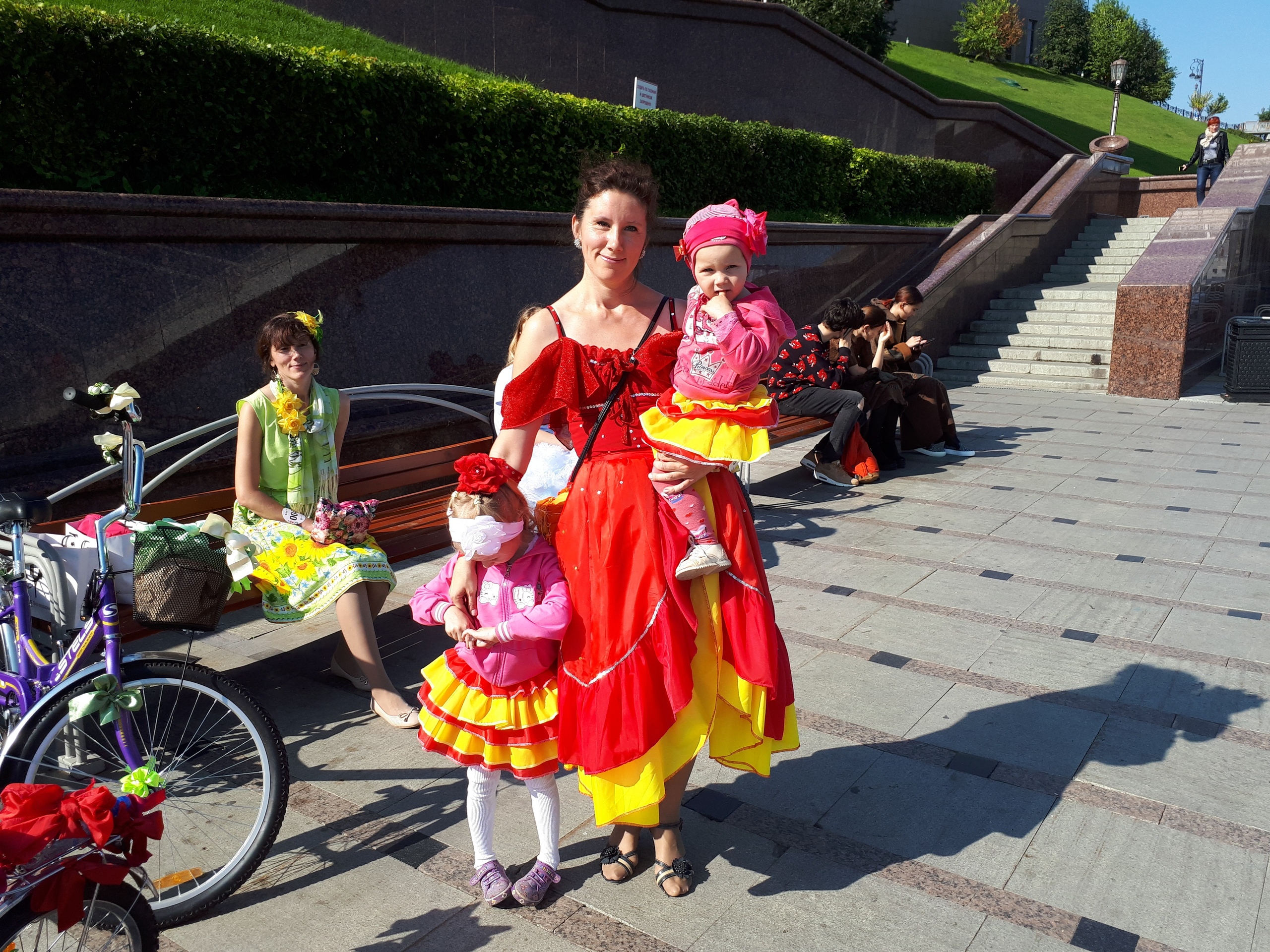 Ирина и ее дочь Настя приехали на набережную в образах цариц полей. Мама девочки призналась, что достаточно плохо катается на двухколесном транспорте, но это не помешало ей придумать костюм и отправиться на набережную.