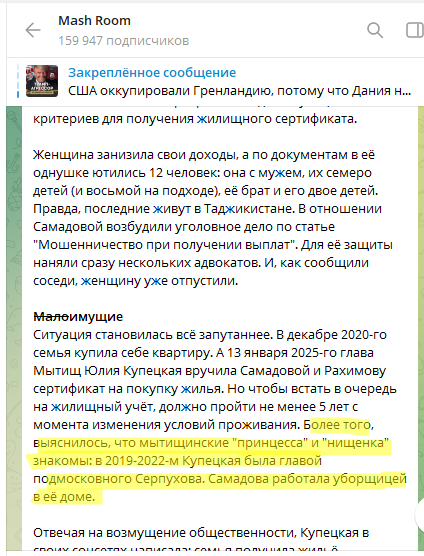 Telegram-канал Mash провел собственное и выяснил, что Глава Мытищ Юлия Купецкая и уроженка Таджикистана Тахмина Самадова уже много лет очень близко знакомы. В период с 2019 по 2022 года, когда госпожа Купецкая занимала пост главы подмосковного города Серпухов, Самадова работала у нее дома уборщицей.