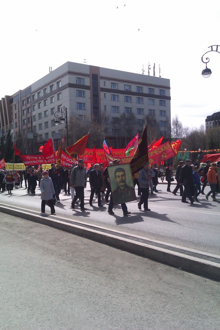 Во главе колонны ехали два автомобиля, из которых были слышны лозунги: «За достойную пенсию!», «За достойную зарплату!», «Бедная молодежь – государство без будущего!» и многие другие. Шествие завершилось на Цветном бульваре. Теперь там проходит праздничный концерт и массовые гуляния. На сцене выступают представители власти и лучшие тюменские коллективы.
