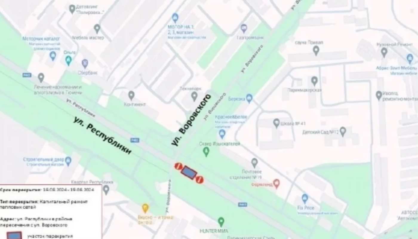 Улицу перекроют с 16 по 19 августа. Прекращено автодвижение будет в районе пересечения ул. Республики с ул. Воровского.