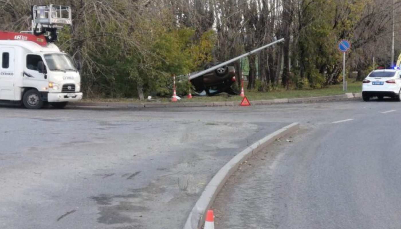 На ул. Магистральной автомобиль "BMW X1" не остановился по требованию автоинспекторов. Началось преследование. Уходя от полицейских, водитель иномарки не справился с управлением и въехал сначала в бордюр, а затем в уличный фонарь и перевернулся на крышу.
