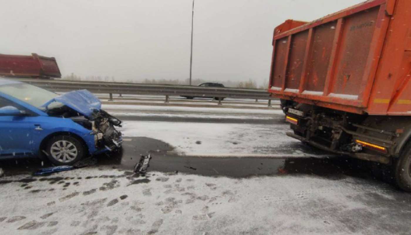 Первое «снежное» ДТП произошло в Тюмени. На участке окружной дороги, между Тобольским трактом и ул. Камчатской, автомобиль «Hyundai» въехал в «КамАЗ».