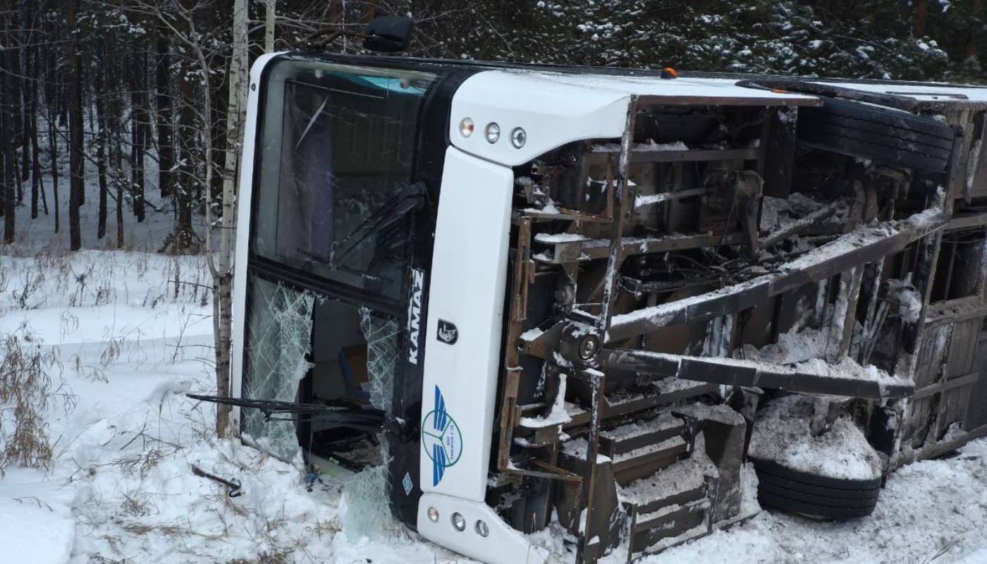 Во время обильного снегопада на затяжном повороте водитель автобуса, судя по предварительным данным, зацепил снежный вал. Это привело к тому, что автобус съехал в кювет и опрокинулся.