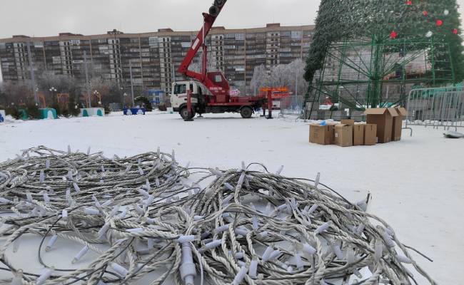 В Тюмени начали демонтаж главной ёлки города – на площади возле драмтеатра. Рабочие уже сняли светящийся шатер, снимают гирлянды, разбирают конструкции.