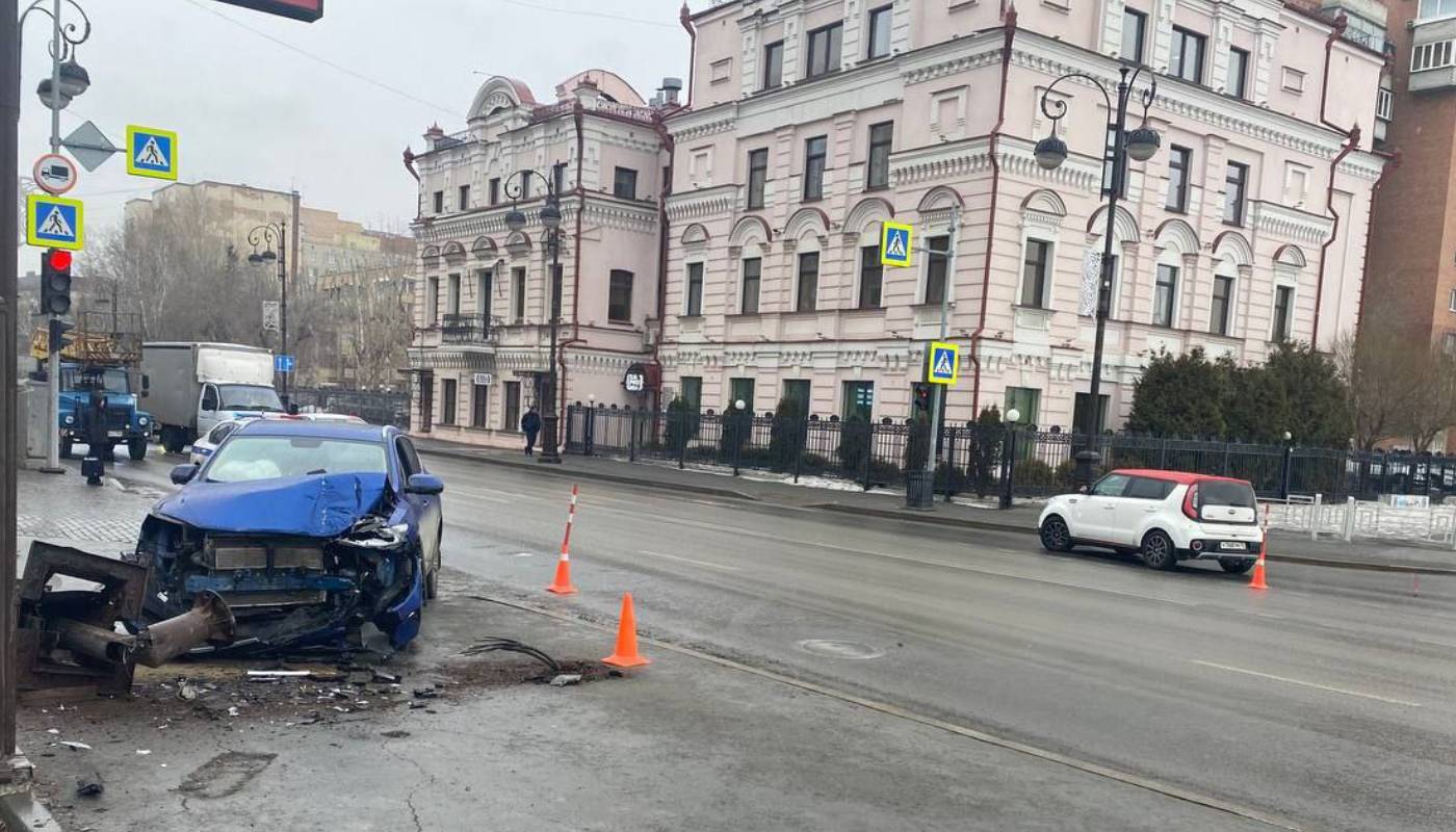 Автомобиль Haval наехал на стоящий Kia. В результате удара одну из иномарок отбросило на столб, который и упал на прохожую.