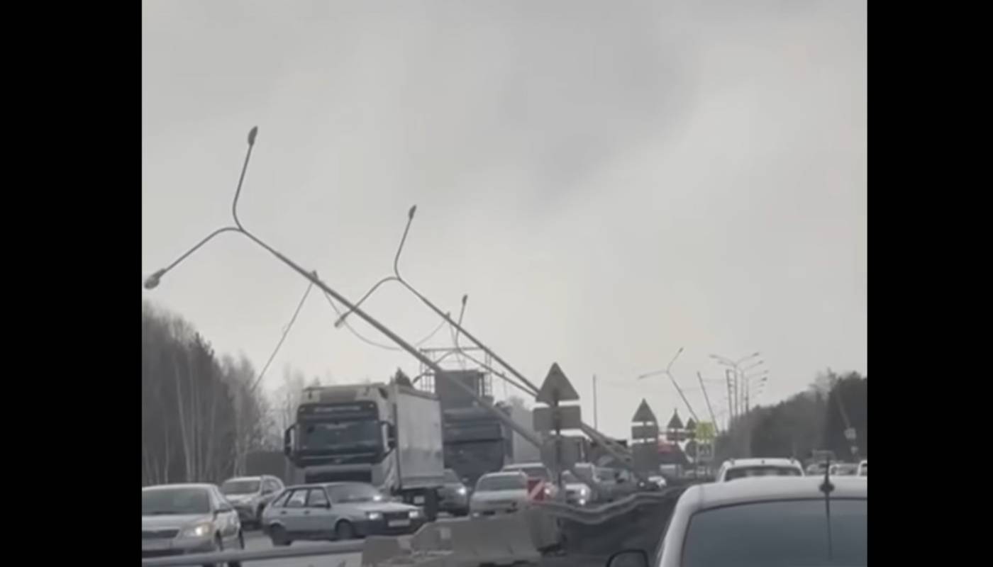 В Тюмени сегодня на Московском тракте наблюдается почти апокалиптическая картина. Вдоль дороги на проезжую часть падают столбы.