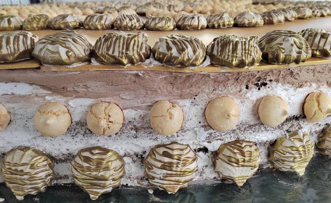 Для торта изготовили 120 коржей размером 60 на 40 см, в основе — шоколадный бисквит. На изделие ушло 100 литров вишневого сиропа, которым пропитан торт, и 120 кг сливок.
