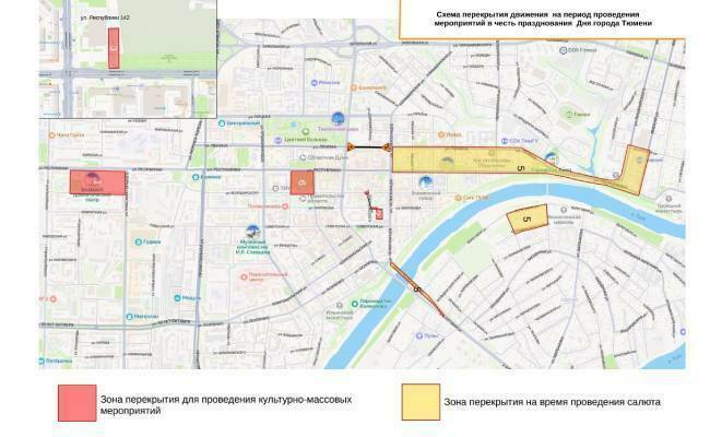 «Мост Челюскинцев будет частично закрыт для движения уже с 18.00. Также на время салюта будут закрыты участки улиц Челюскинцев и Республики, «квадрат» на Ямской/Луначарского, а также в створе улиц Большая Заречная — Береговая. Традиционно движение будет ограничено возле драмтеатра, Технопарка и площади 400-летия Тюмени», — пояснил чиновник.