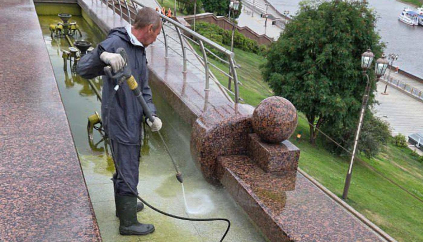 Сооружение требует бережного ухода и промывается исключительно вручную. Гранитные поверхности очищают с помощью аппаратов высокого давления нейтральным моющим средством. После проведенных процедур вода в фонтане снова будет чистой.