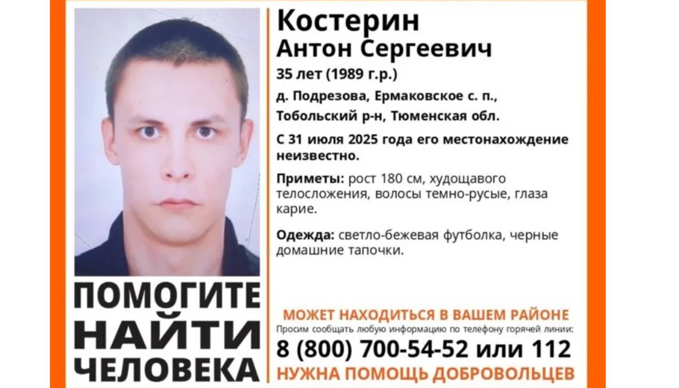 Антон Костерин пропал в деревне Подрезова Тобольского района 31 июля.