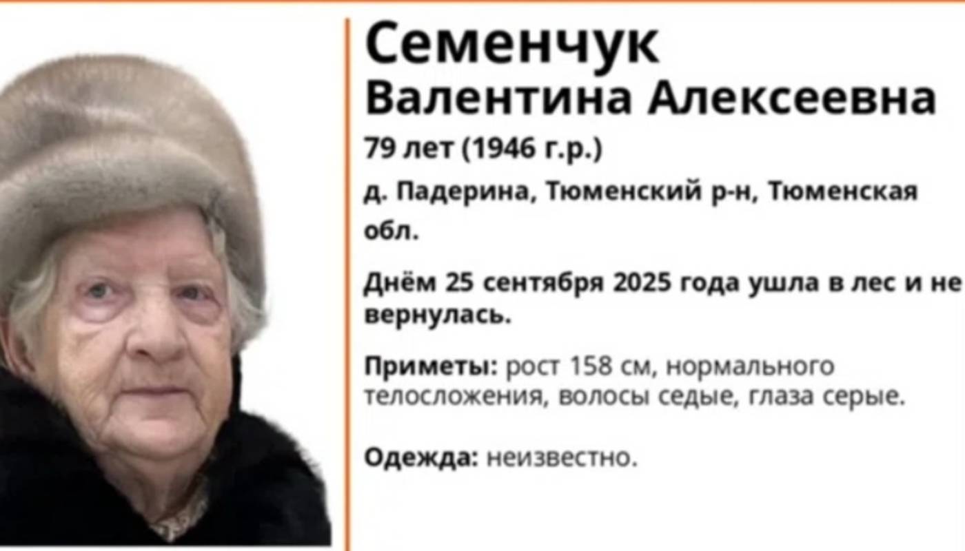 В Тюмени ищут 79-летнюю пенсионерку. Валентина Семенчук ушла днем 25 сентября в лес и не вернулась.