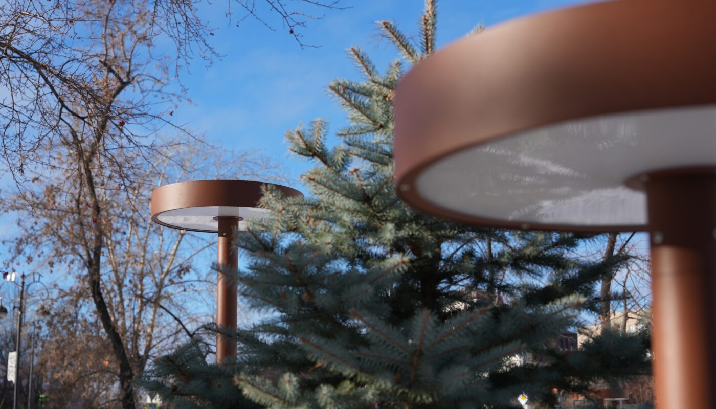 Особое внимание привлекает оригинальное оформление светильников – в виде гвоздей. Вокруг мемориала станкостроителям, погибшим на фронтах Великой Отечественной войны, высажены многолетние злаковые растения, среди которых и размещены светильники.