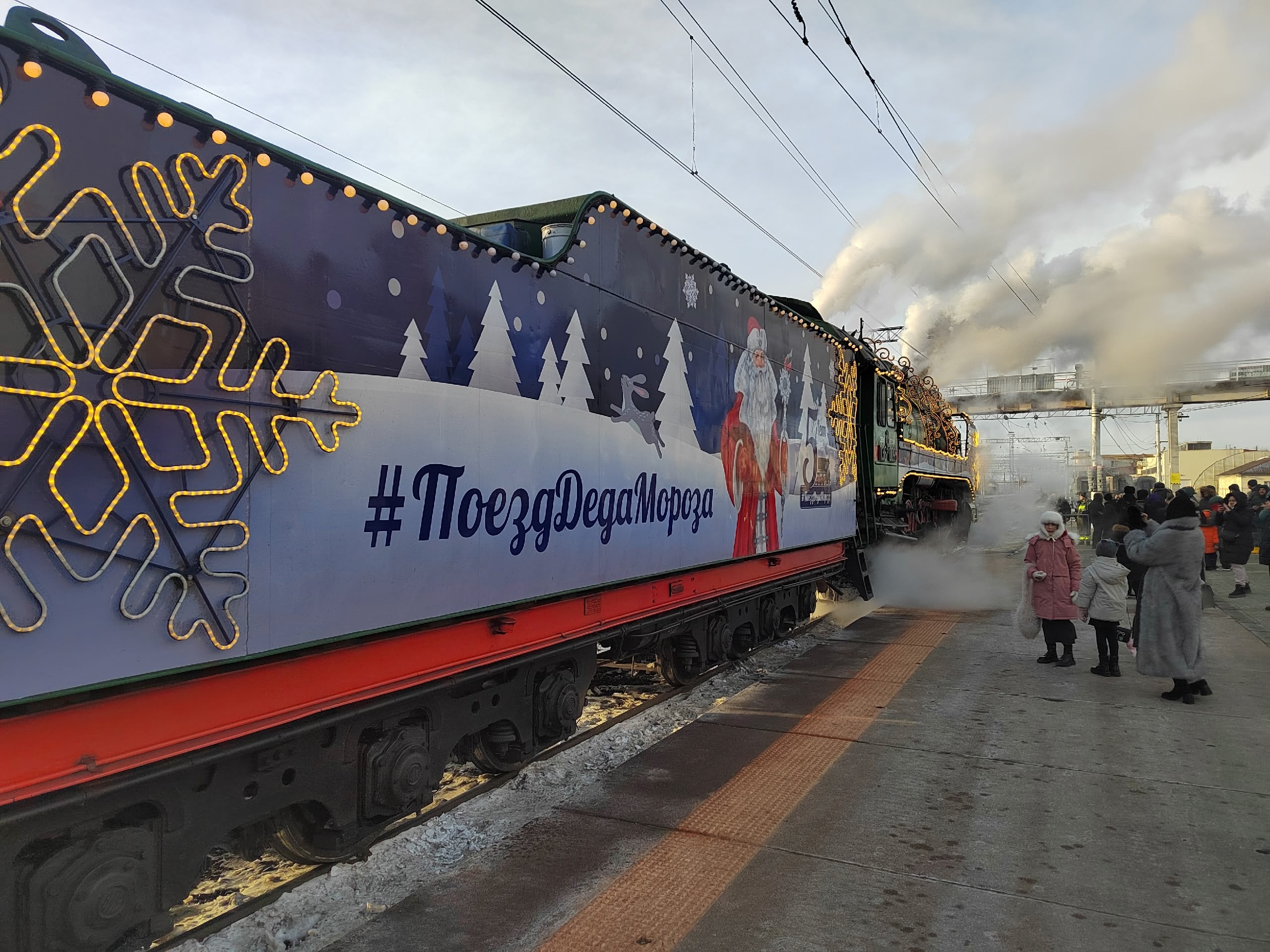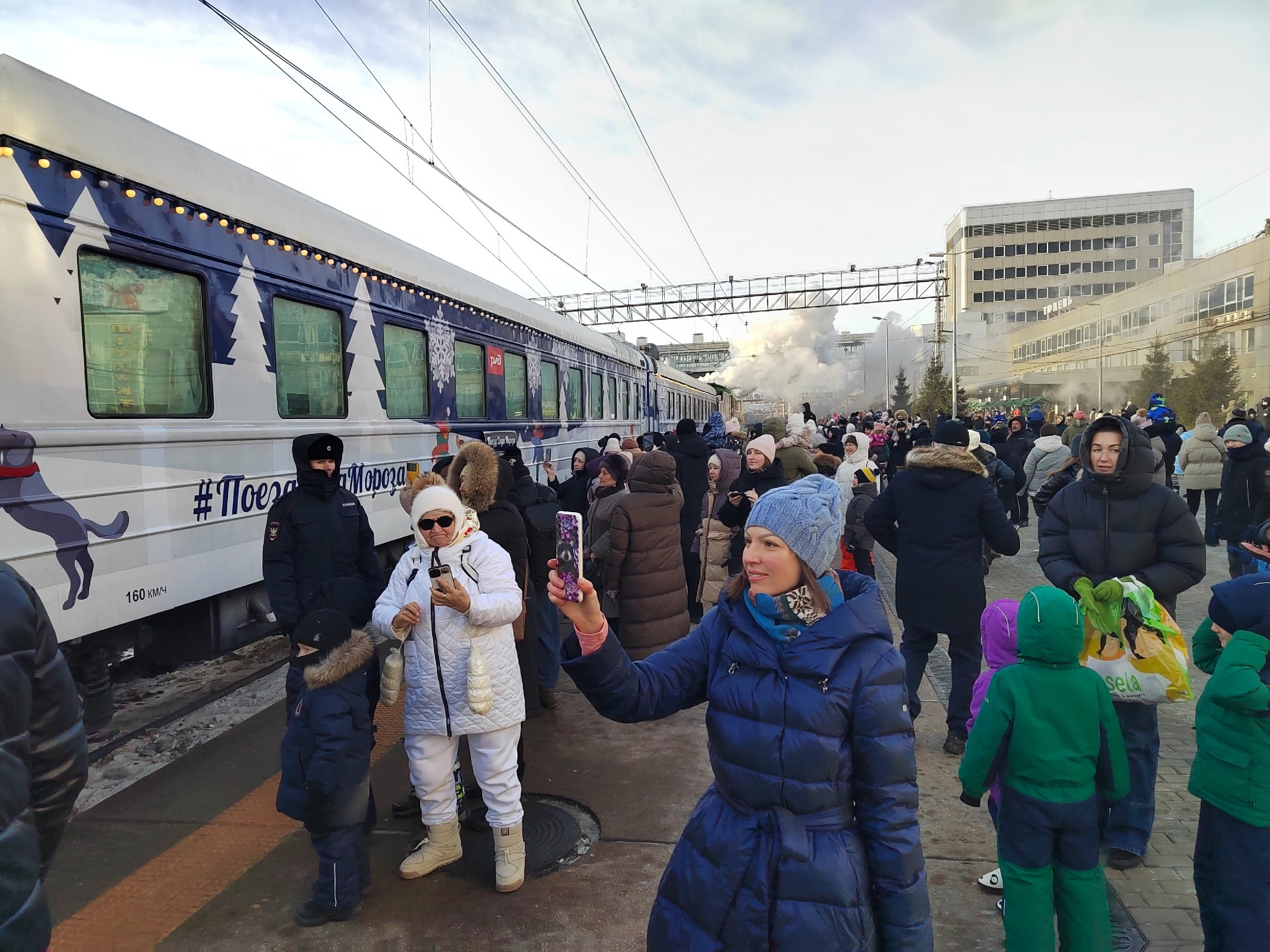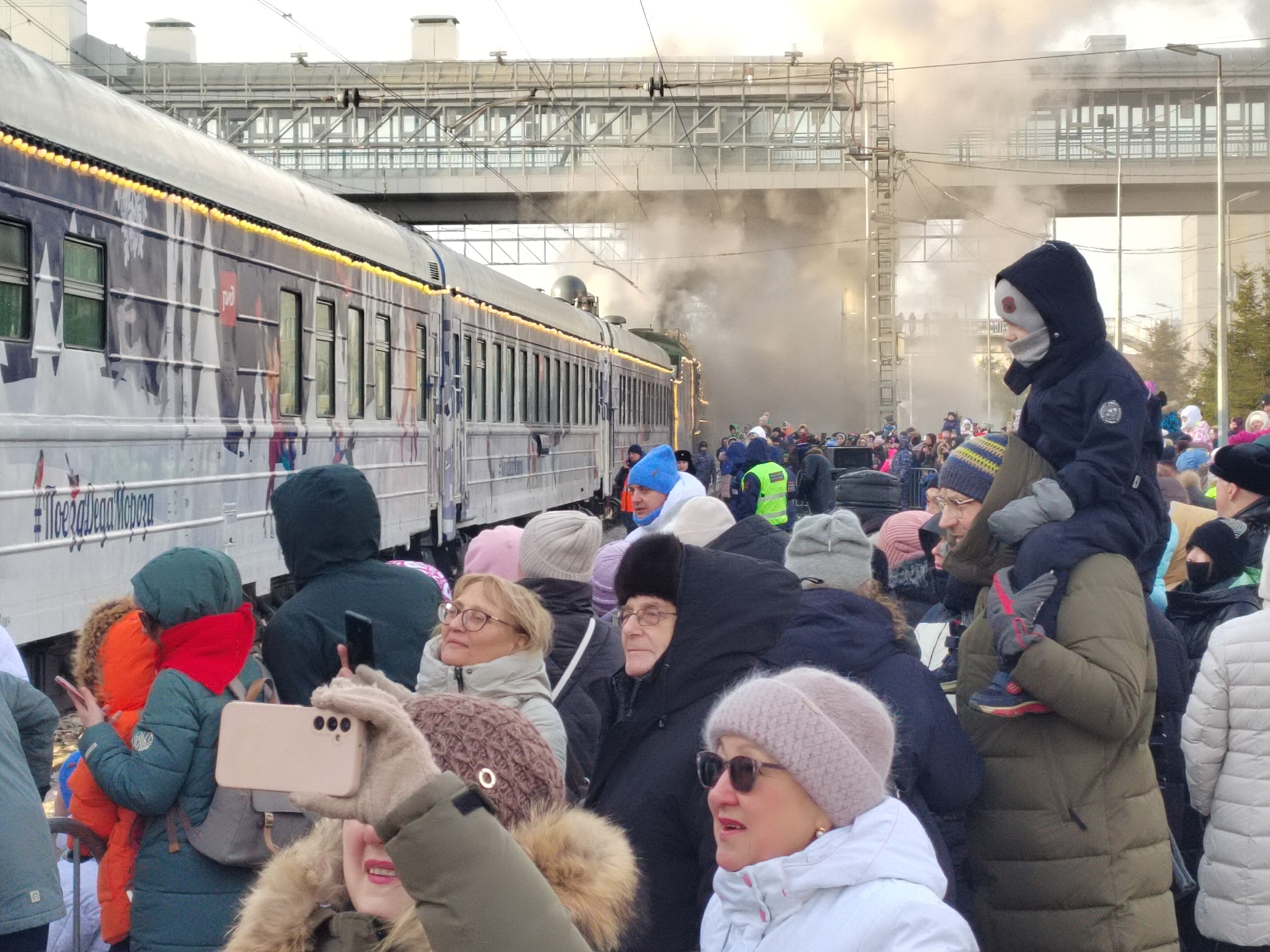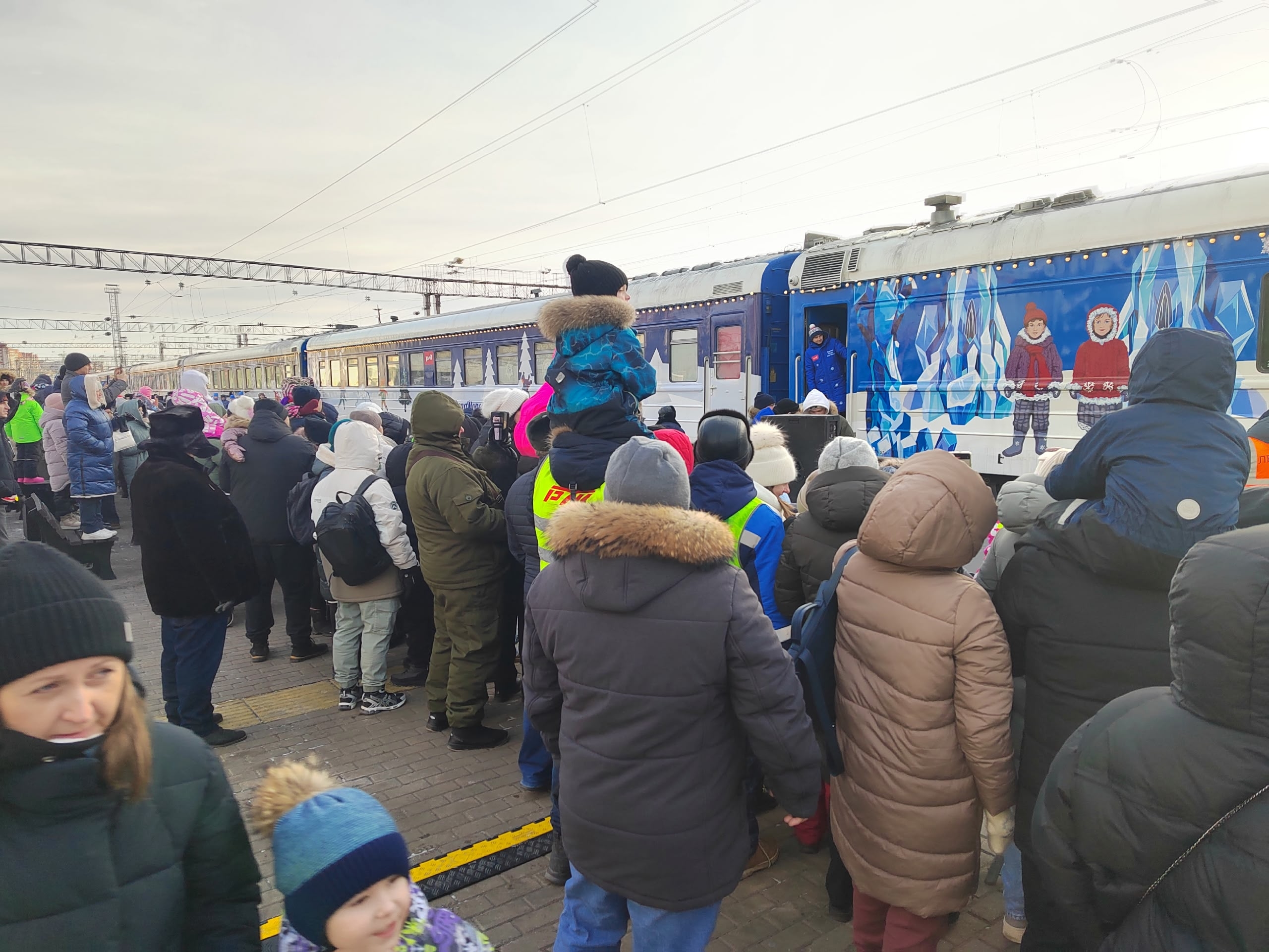 На железнодорожной вокзале Тюмени в эти минуты очень шумно. Тысячи тюменцев пришли на станцию целыми семьями, чтобы увидеть Деда Мороза.