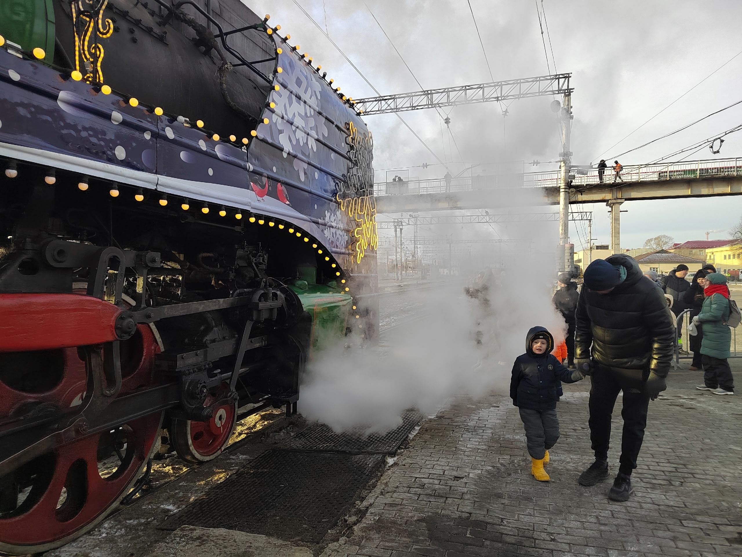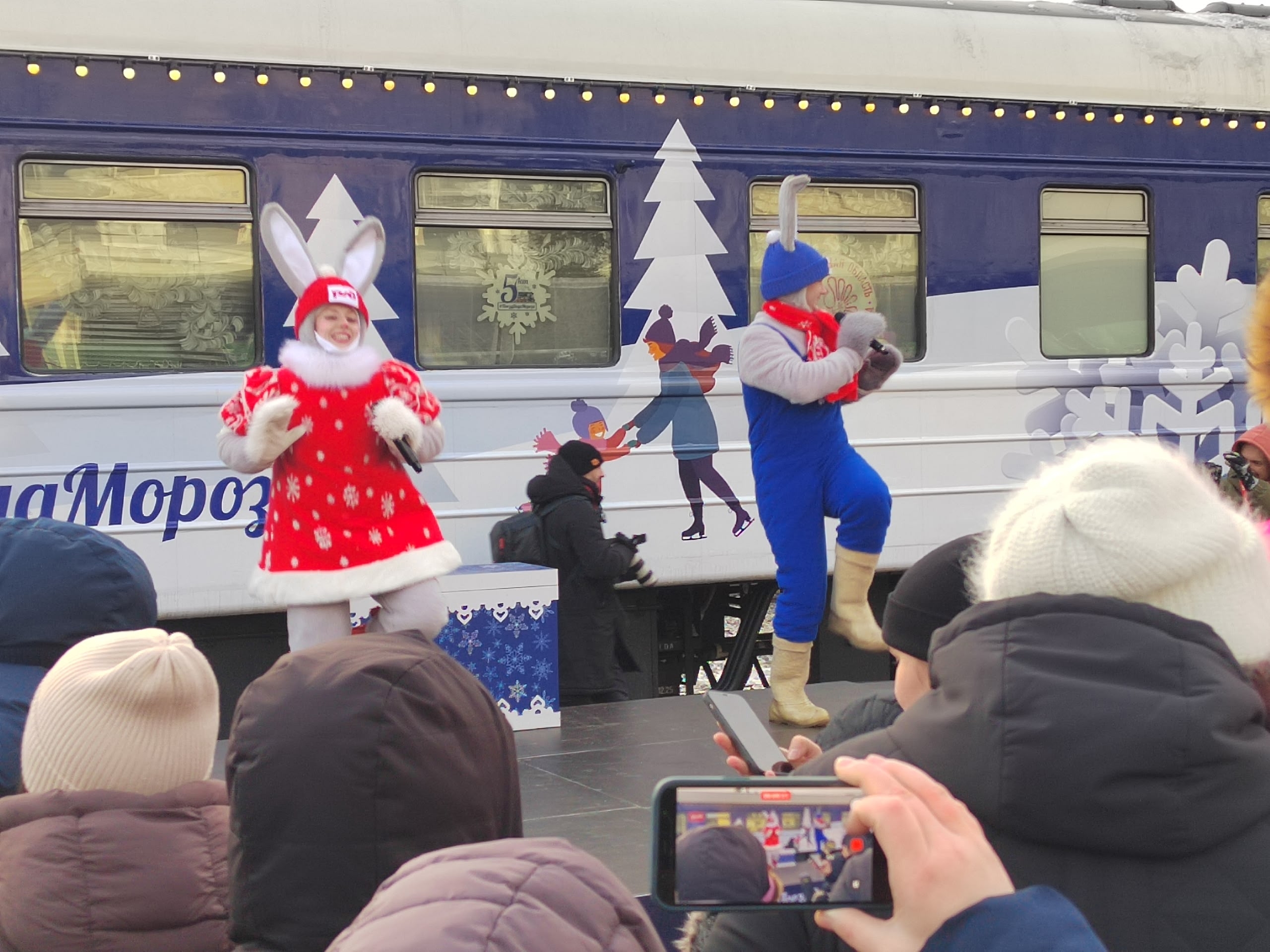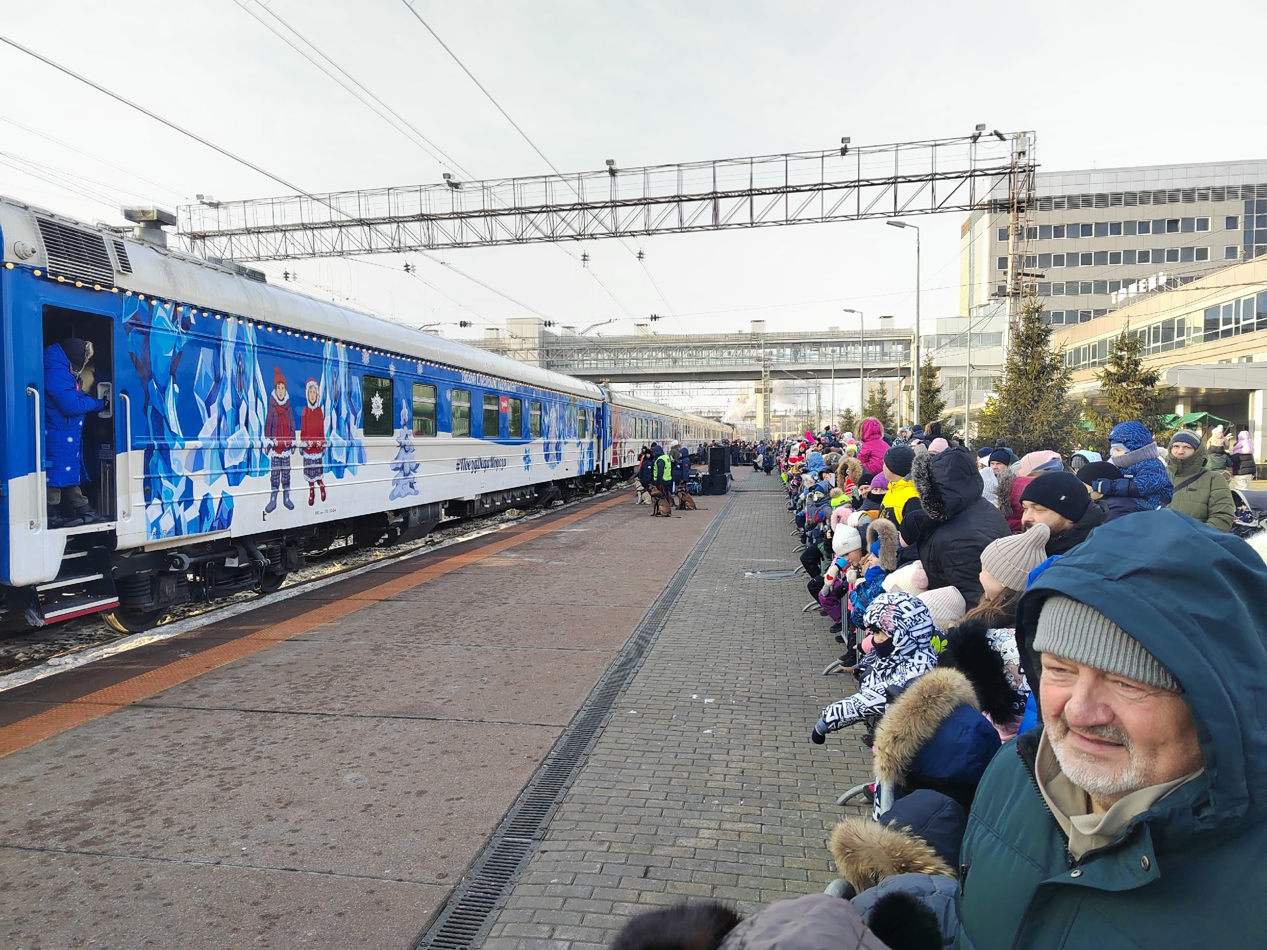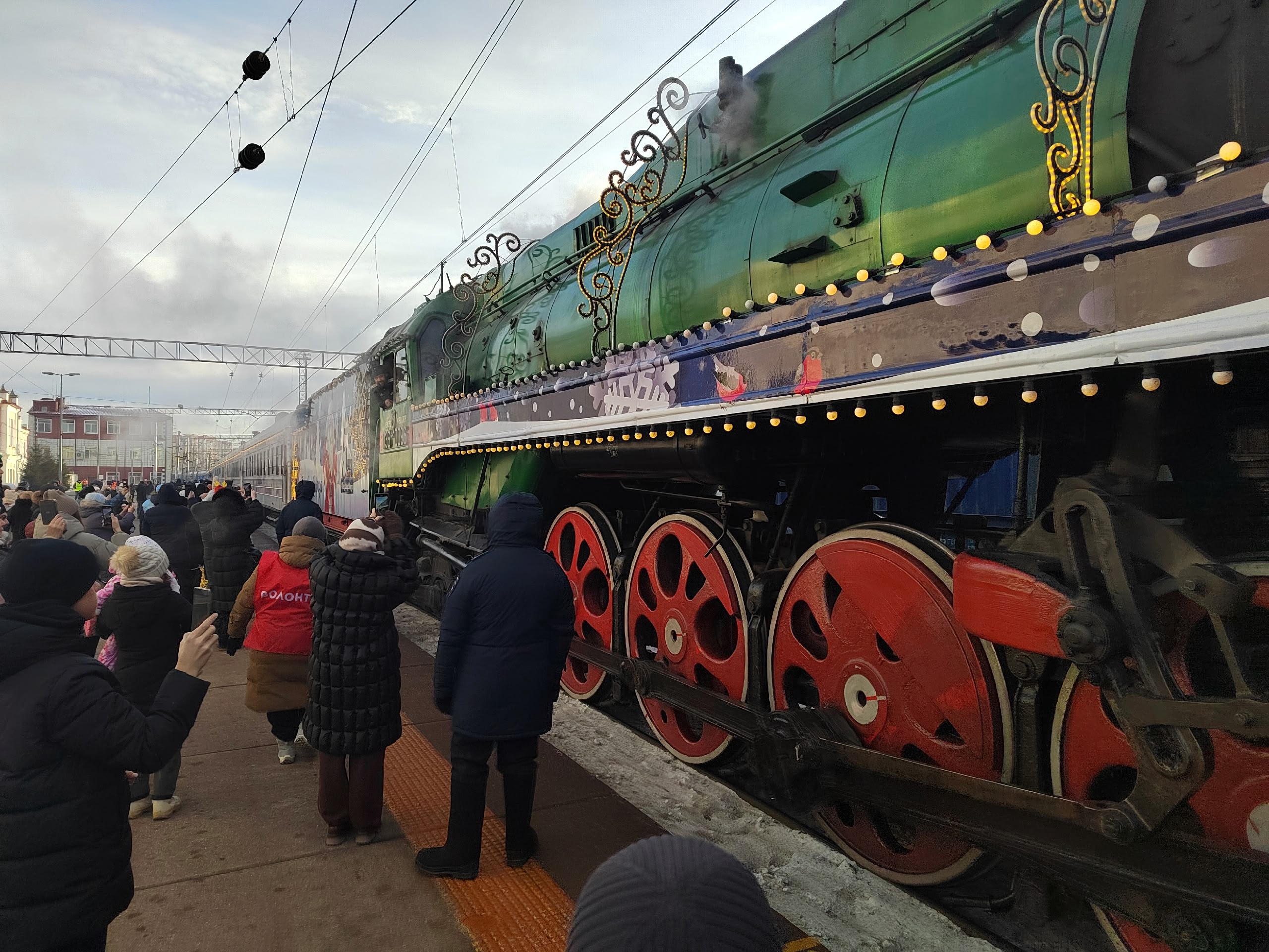 На железнодорожной вокзале Тюмени в эти минуты очень шумно. Тысячи тюменцев пришли на станцию целыми семьями, чтобы увидеть Деда Мороза.