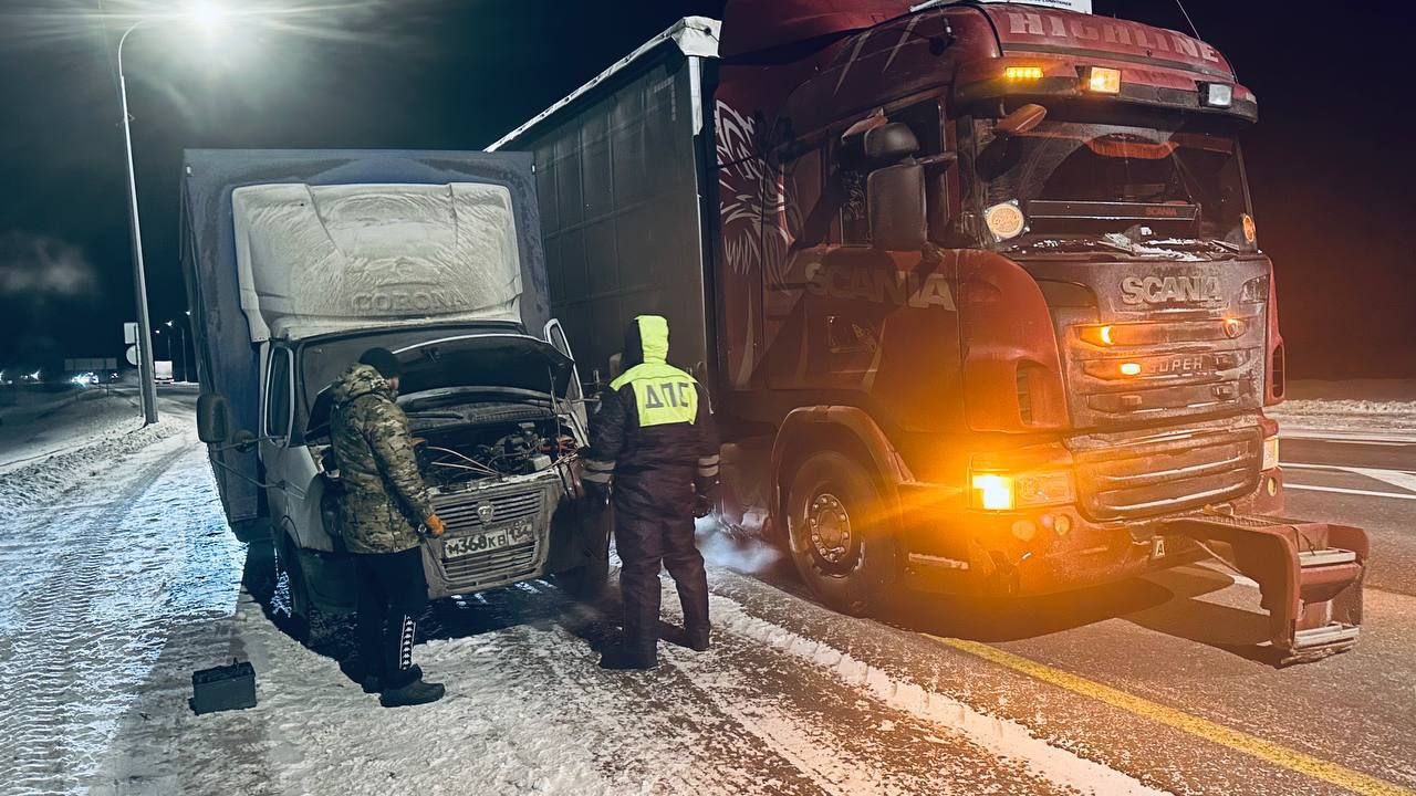 Сотрудники Госавтоинспекции отогрели замерзшего водителя в машине ДПС, напоили горячим кофе, отвезли его на ближайшую АЗС и помогли запустить двигатель с помощью остановленного транспорта.