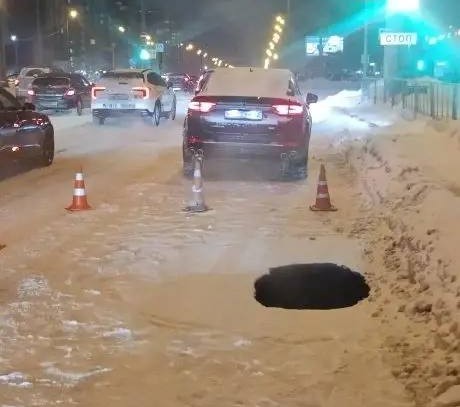 Накануне в районе перекрестка улиц Пермякова и Широтной из-за проседания асфальтового покрытия на дороге образовалась дыра.