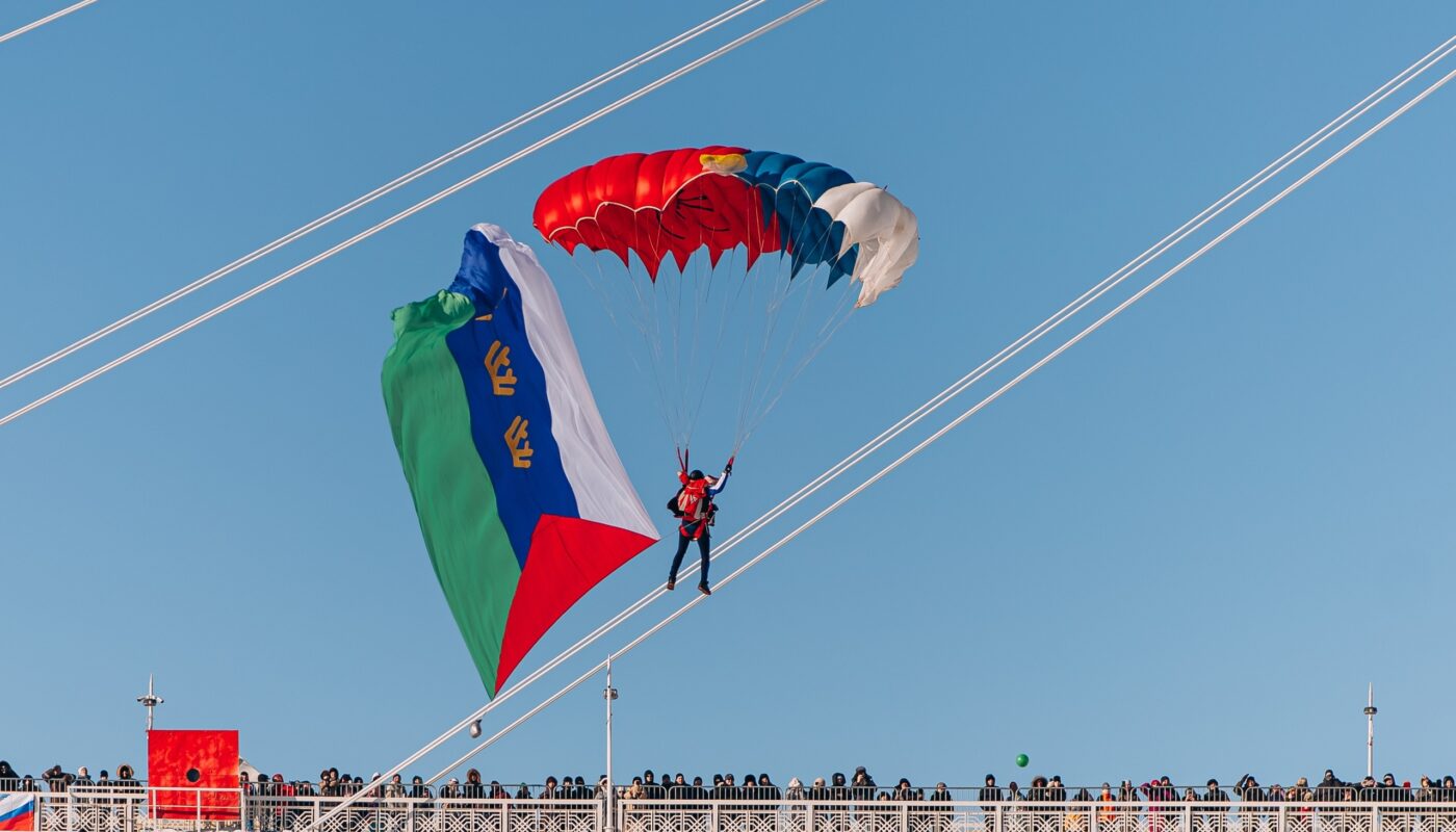 Вертолет ЮТэйр, осуществил массовый десант парашютистов, демонстрационный полет над центром Тюмени, снизился и завис над набережной.