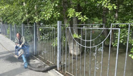 За сутки в городе выпало 39% месячной нормы осадков. Дорожники продолжают ликвидировать последствия вчерашнего ливня. В Восточном сквере для откачки воды применили мотопомпу.